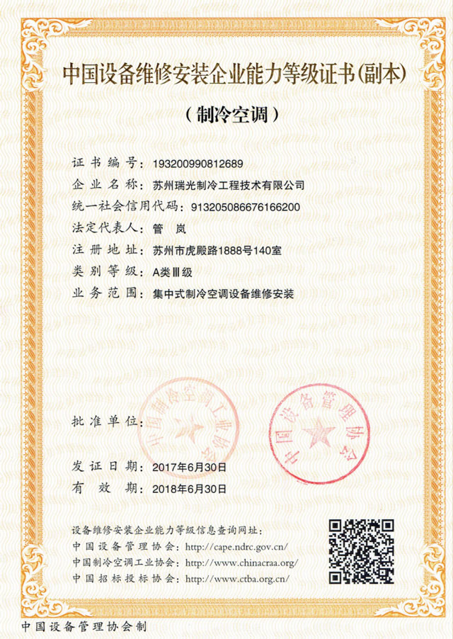 苏州瑞光制冷工程技术有限公司 是一家从事制冷设备工程安装、维修、保养的专业公司。