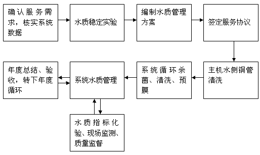 6、日常维护:定期对水质进行取样化验,对冷却水、冷冻水进行监测、排污、加药,控制浓缩倍数,使系统在正常状况运转。
